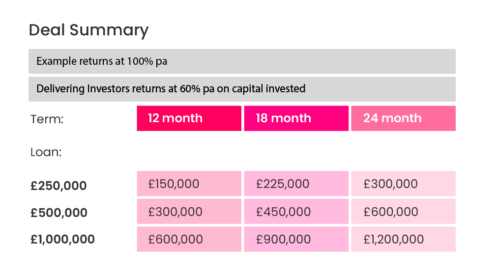 We provide investors with the opportunity to earn up to 60% pa return on their investment when participating in a loan with Super-Mezz